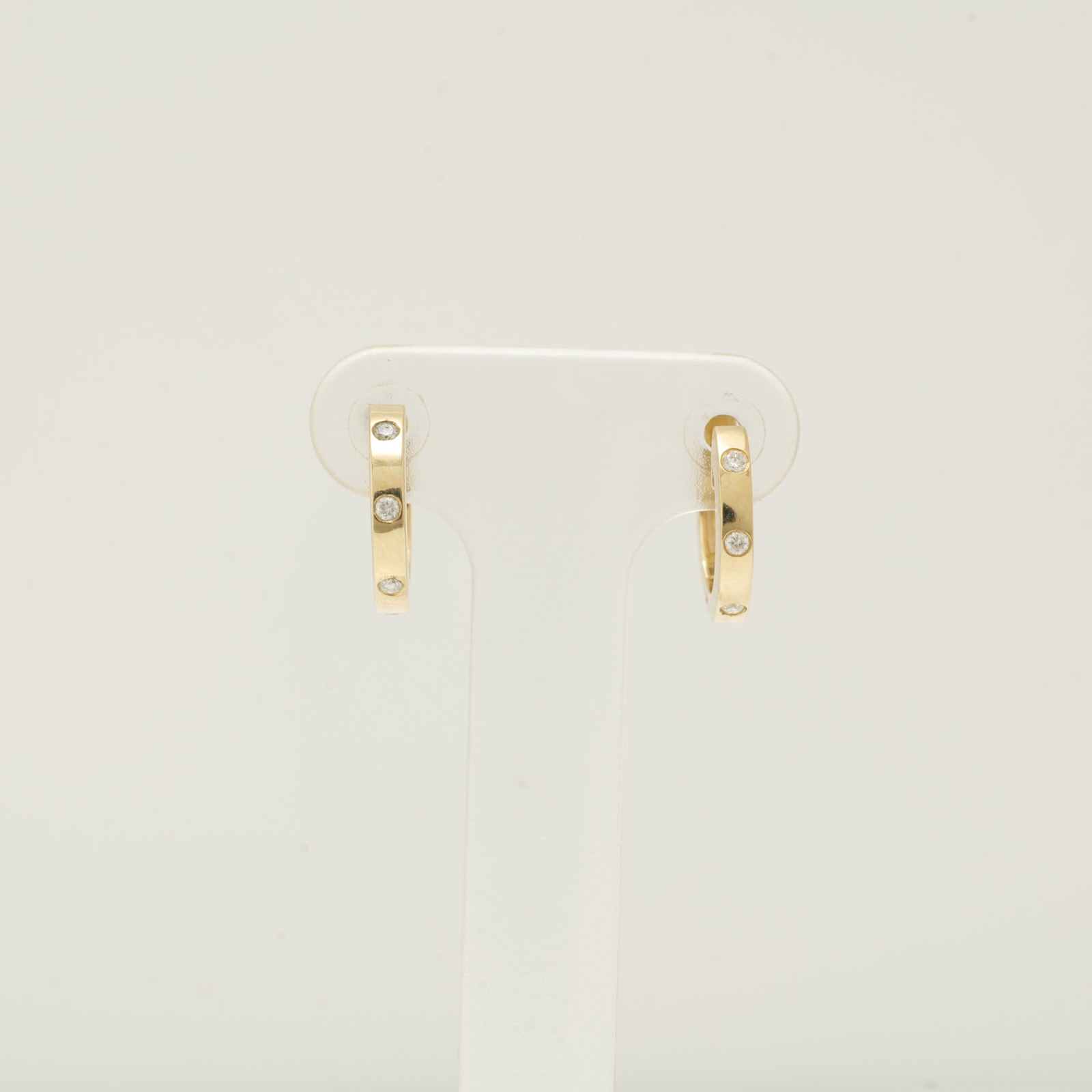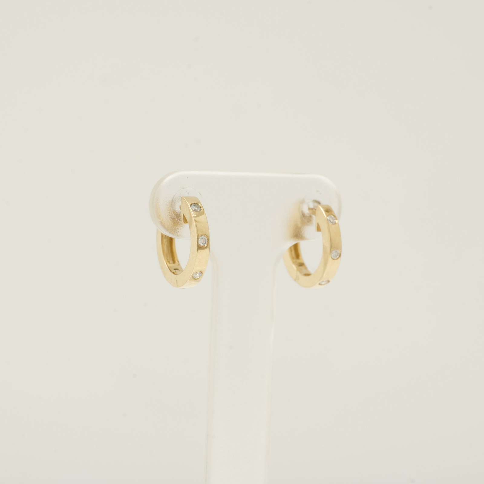 Sleek gold kid’s huggie hoops with natural diamonds spaced along the band. Secure hinged closure ensures a snug fit. Lightweight for everyday wear or layering. Perfect for casual styling, work, or gifting.