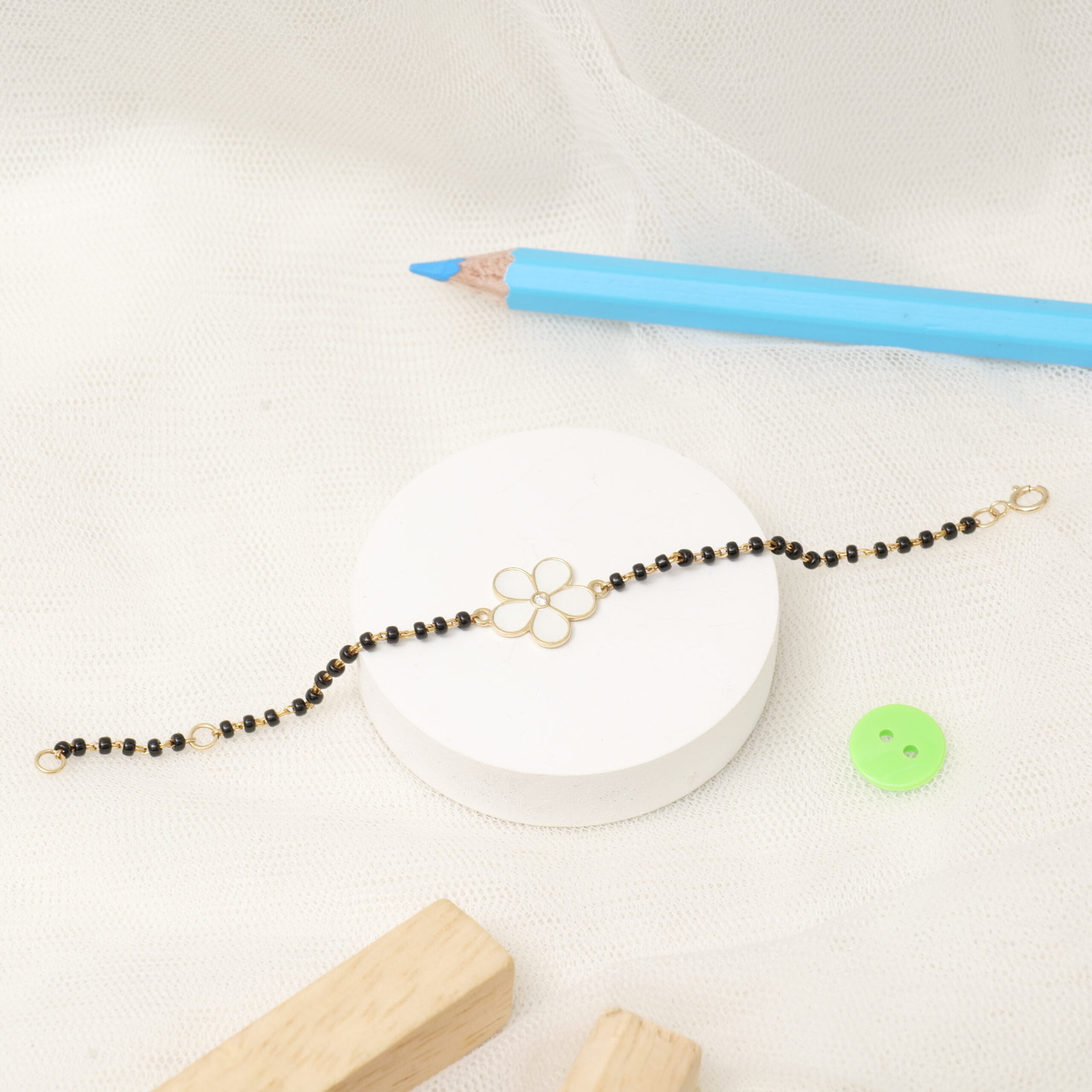 This kids’ nazaria bracelet features a delicate floral motif crafted in 14k solid gold with a sparkling natural diamond at the center. The black beaded chain adds protective significance, blending traditional symbolism with modern style. Lightweight and secure, this bracelet is designed for daily wear while carrying cultural meaning. A perfect keepsake for birthdays, festivals, and family celebrations.
