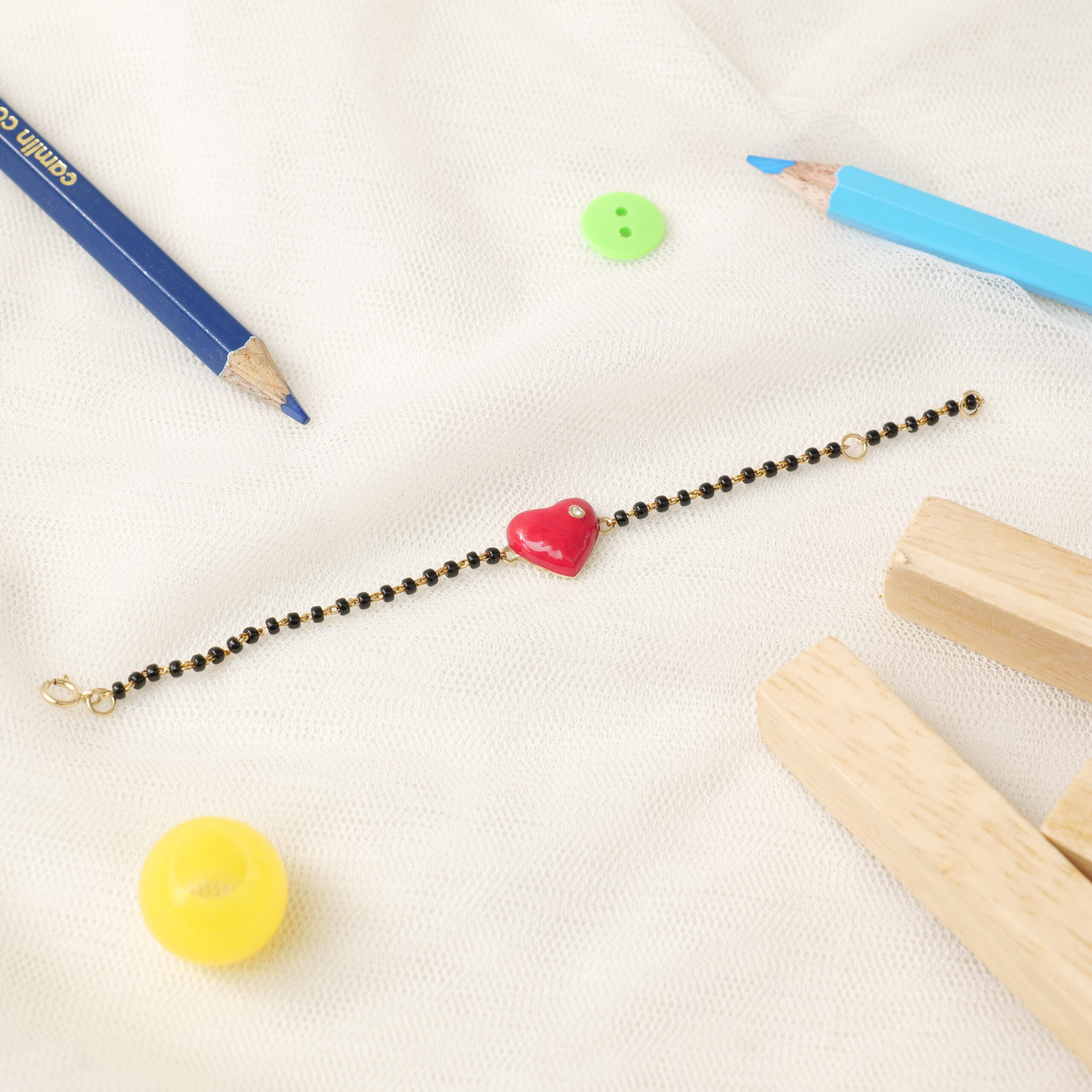 This kids’ nazaria bracelet showcases a bright red heart charm in enamel, accented with a sparkling natural diamond, set in 14k solid gold. The charm is linked to a traditional black beaded chain, symbolizing cultural protection and positivity for little ones. Designed to be lightweight, safe, and comfortable, this bracelet carries both playful charm and meaningful tradition. A lovely gift for birthdays, baby showers, and festive occasions.