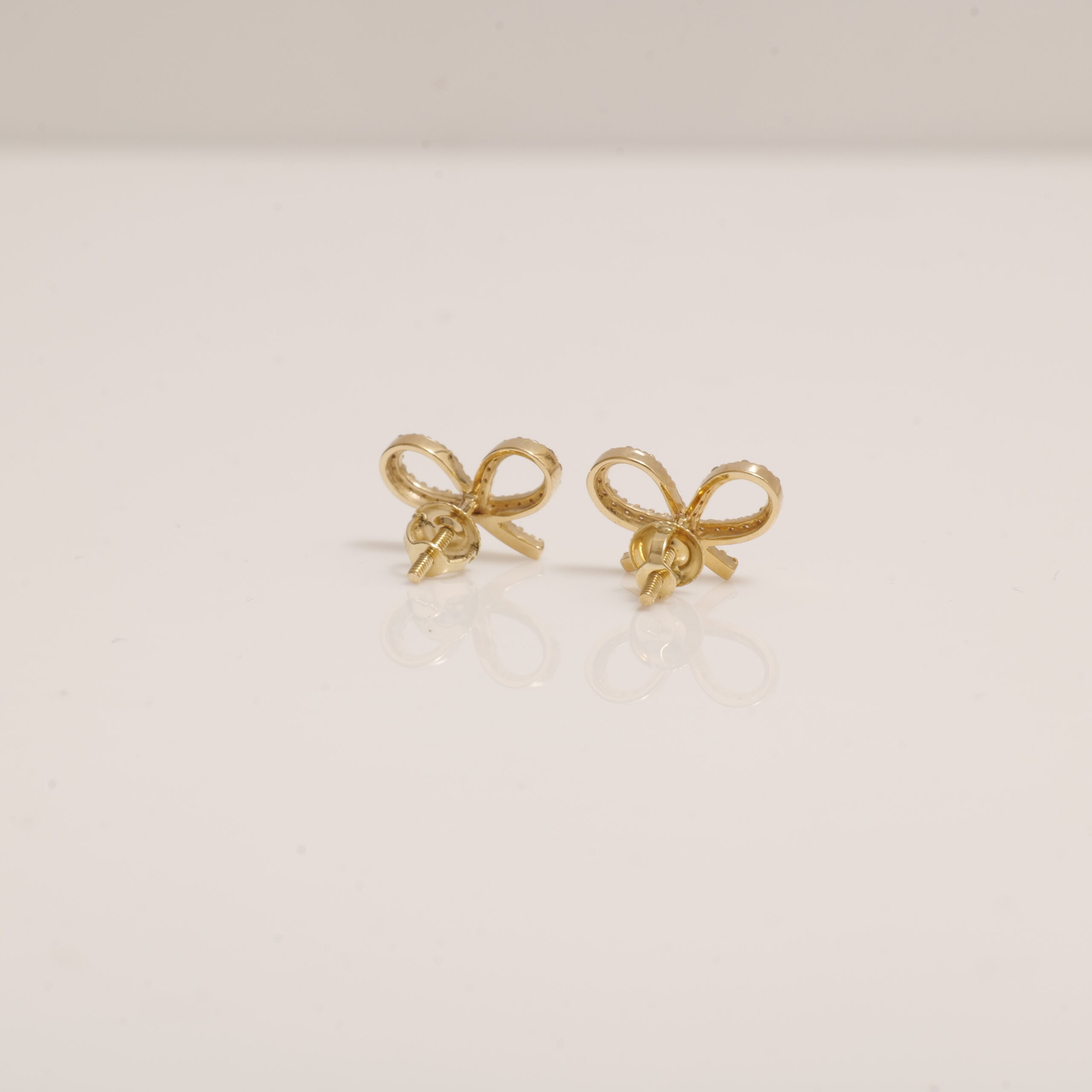 These ribbon bow earrings feature a looped silhouette lined with natural diamonds, designed in 14k solid gold. The minimalist outline forms a soft, airy bow, perfect for toddlers and young girls who enjoy graceful styles. The screw-back closure ensures a secure and comfortable fit for daily wear. A lovely gift for birthdays, school events, or moments that deserve a delicate touch of sparkle.