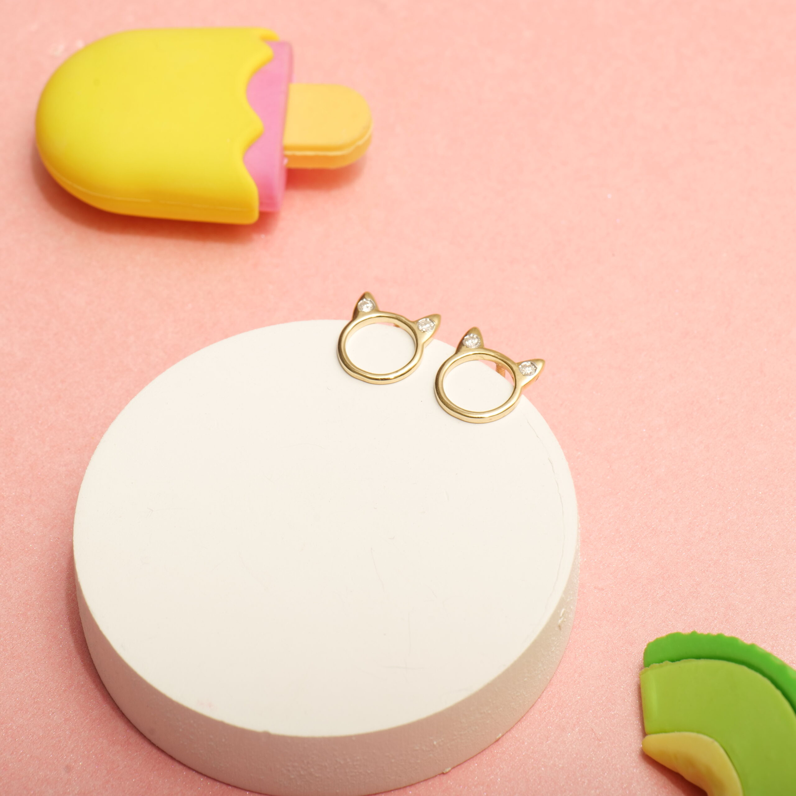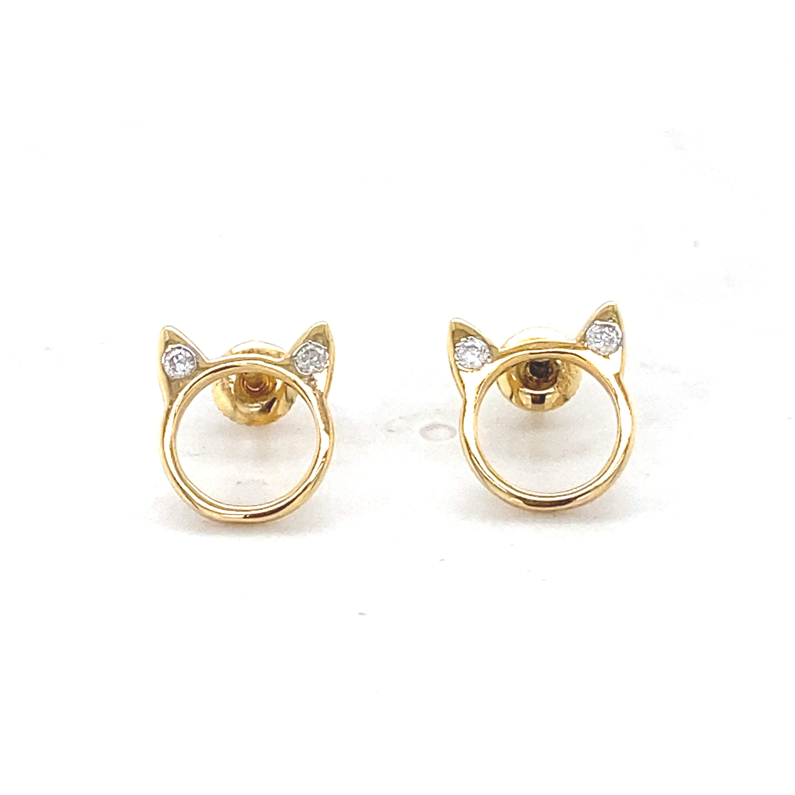 These cat ear outline earrings are crafted in 14k solid gold with a playful open circle design topped with tiny pointed ears. Each ear is accented with a natural diamond, adding a sparkly finish to this modern silhouette. Light, smooth, and secured with screw-back posts, these earrings are a charming and safe accessory for kids who love cats or animal-themed jewelry.