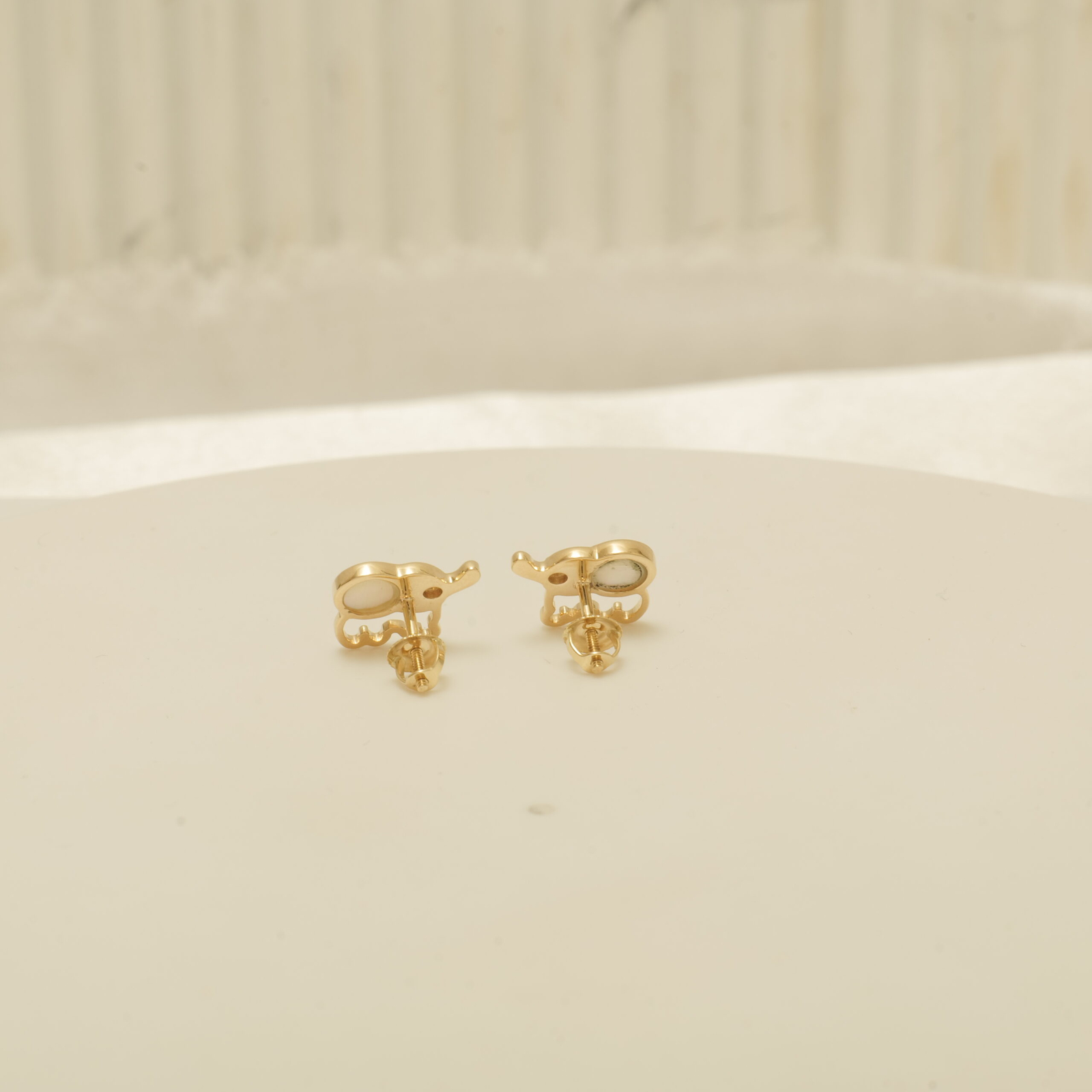 These playful elephant-shaped stud earrings feature a smooth mother-of-pearl dome forming the elephant’s body, paired with a tiny natural diamond marking the eye. Crafted in 14k solid gold, the outline is minimal yet expressive, capturing the elephant’s form with soft curves. The earrings are designed with secure screw-back posts to ensure comfort and safety for everyday wear. A gentle nod to childhood joy and animal charm, these studs make for a thoughtful, long-lasting gift.