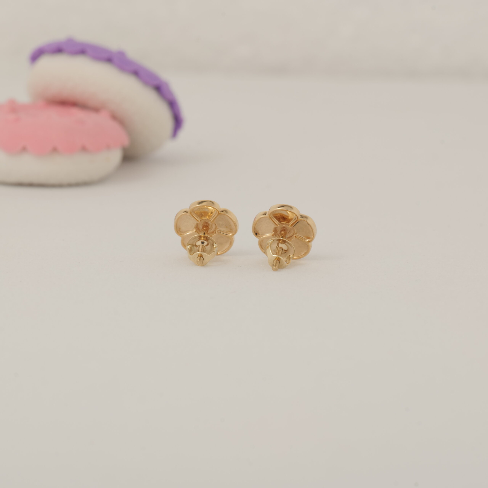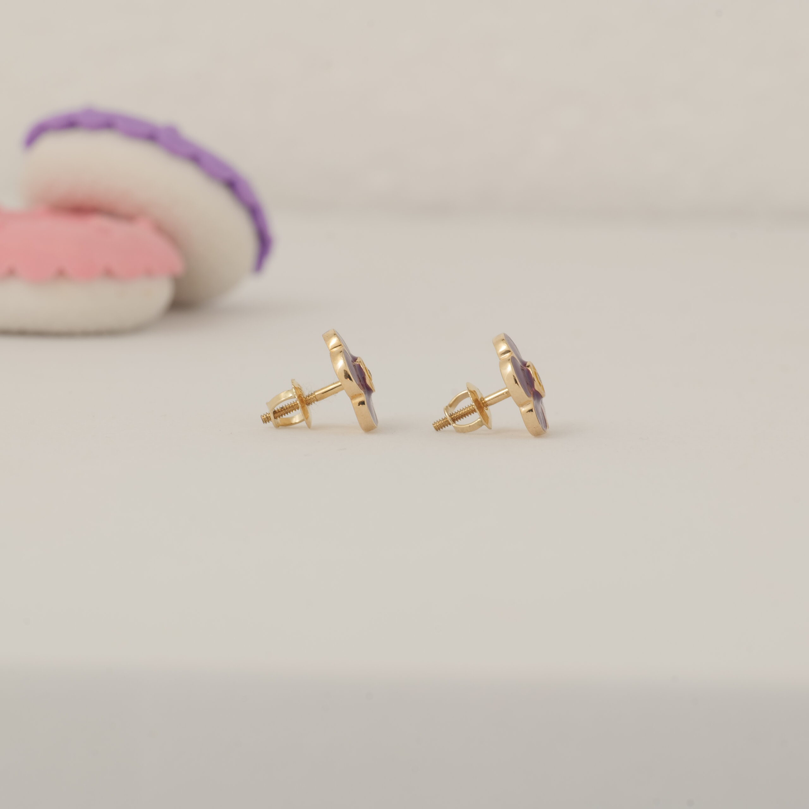 These floral stud earrings are designed in a five-petal flower silhouette, finished in rich purple enamel with a yellow center and a sparkling natural diamond in the middle. Crafted in 14k solid gold, they bring together color, charm, and sparkle in a lightweight design that’s perfect for little ears. With secure screw-back closures, these earrings are made to stay safely in place while adding a blooming touch to every outfit.