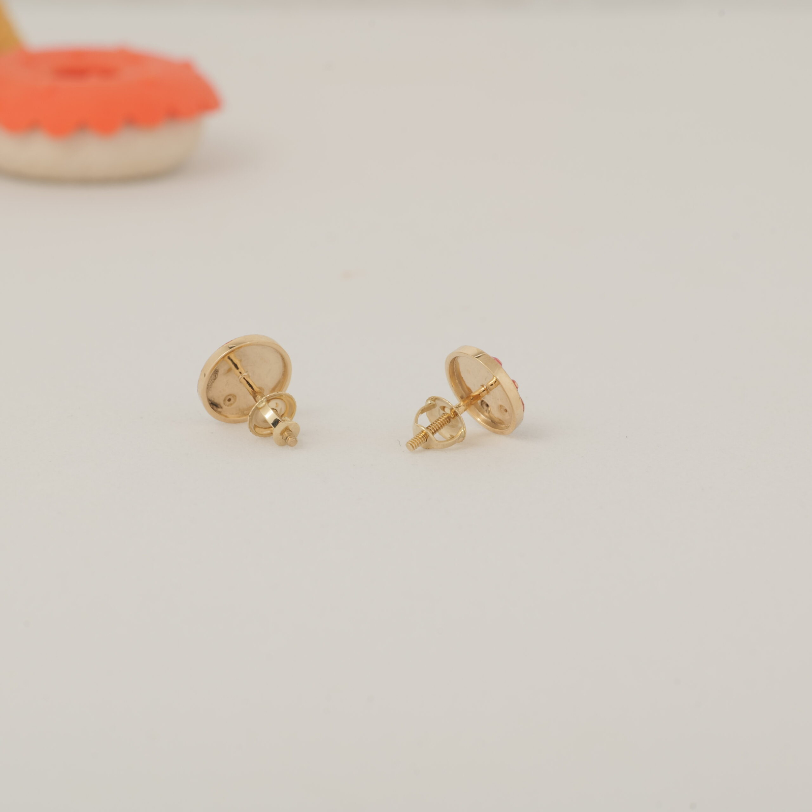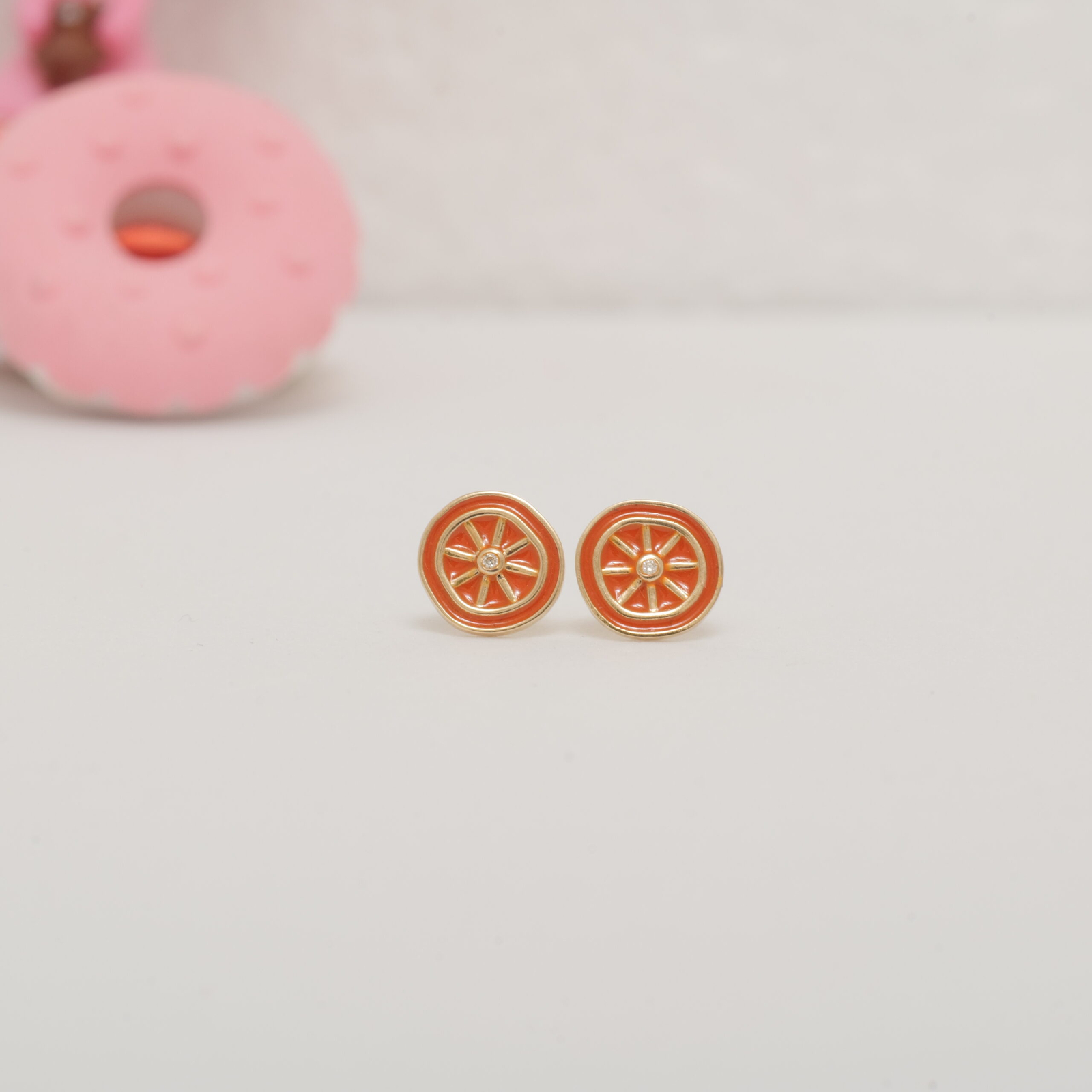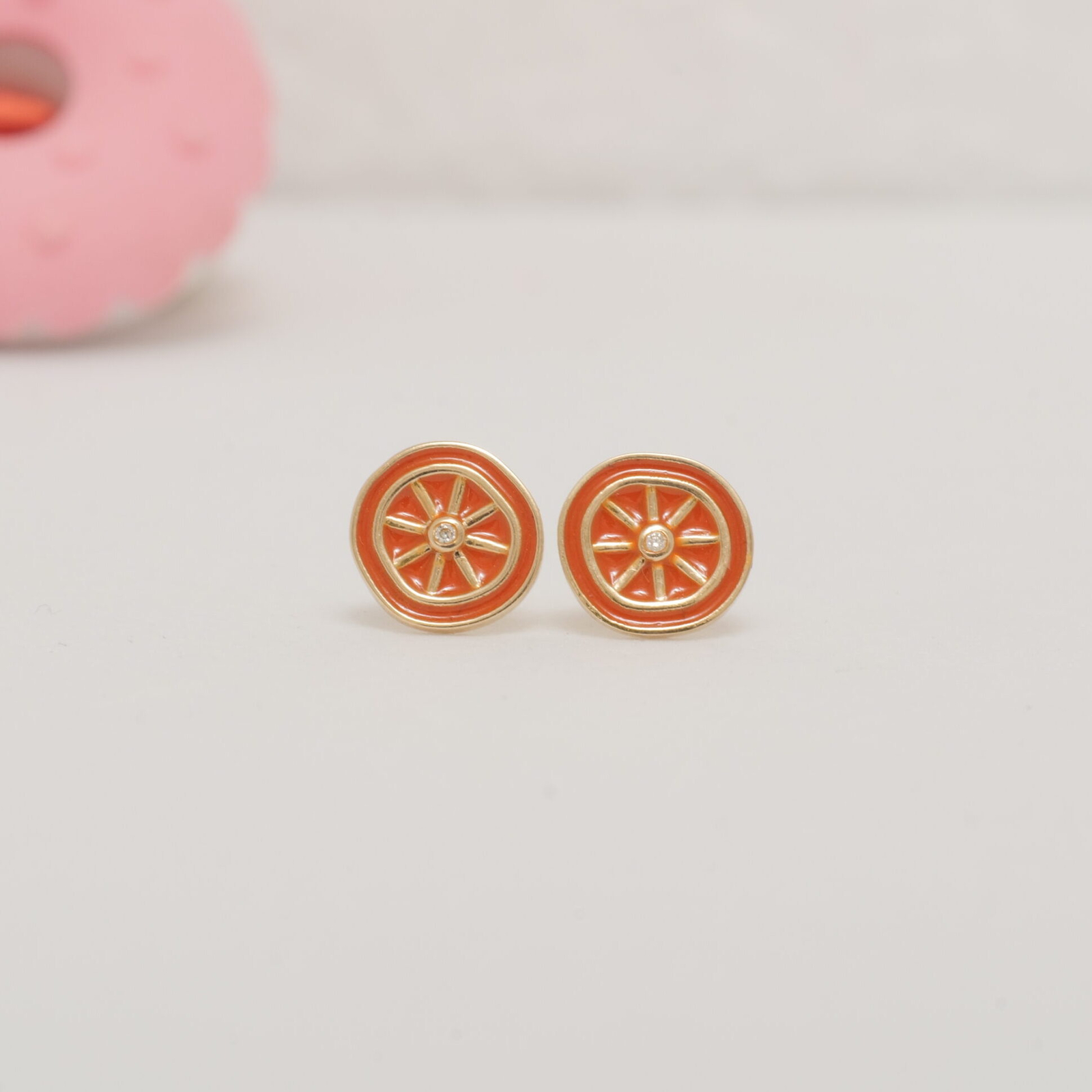 These orange fruit earrings bring a playful twist to everyday kids’ jewelry. Made in 14k solid gold, each stud is designed to resemble a citrus slice with vibrant orange enamel segments and a sparkling natural diamond at the center. The irregular outline adds a handcrafted feel to the fruity form. Fitted with secure screw-back posts, these earrings are safe and lightweight for toddlers and young girls. A cheerful piece perfect for gifting and daily wear.