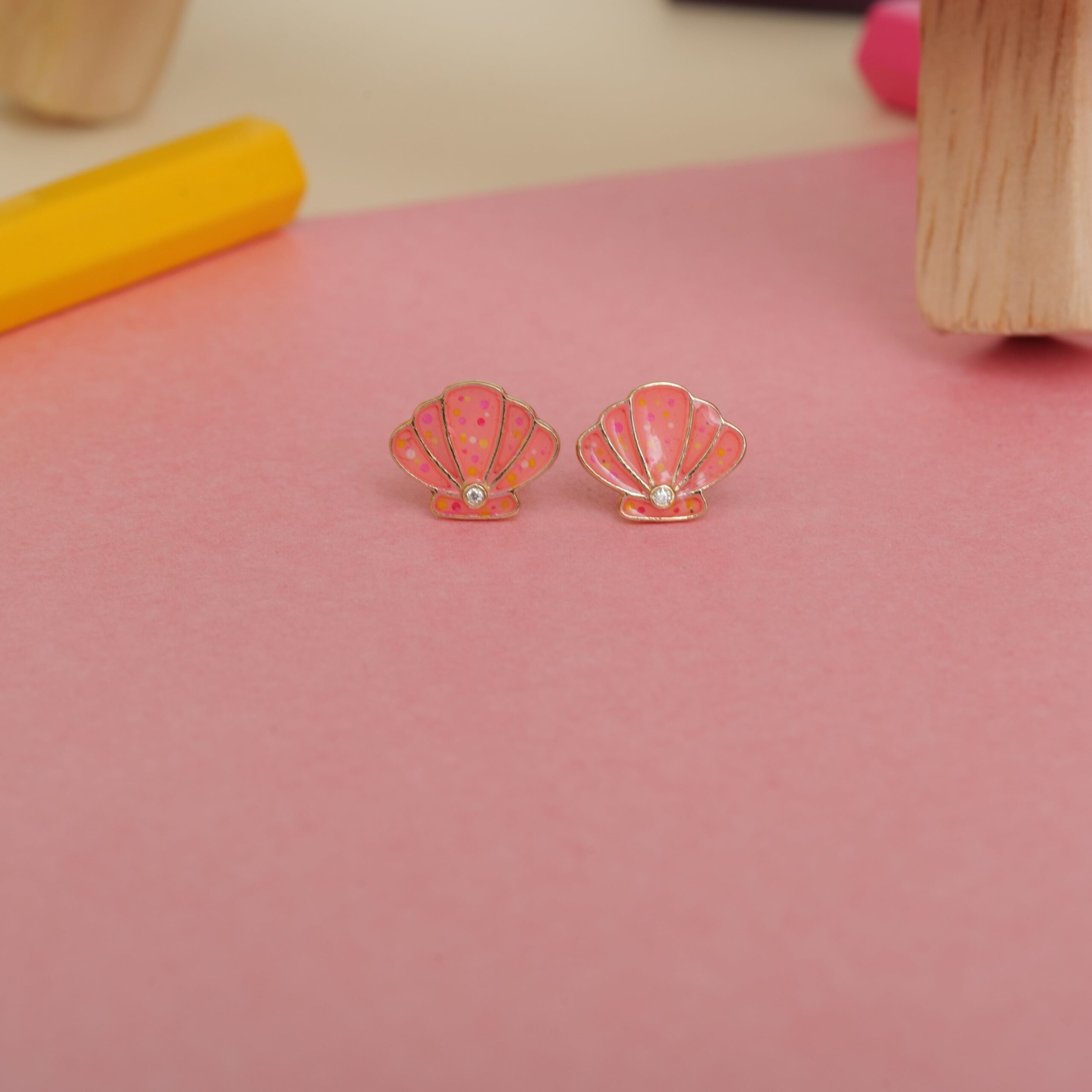 Kids Seashell Diamond Stud Earrings, 14k Solid Gold With Enameling, Natural Diamonds, Kids jewelry, Gift for toddlers/girls