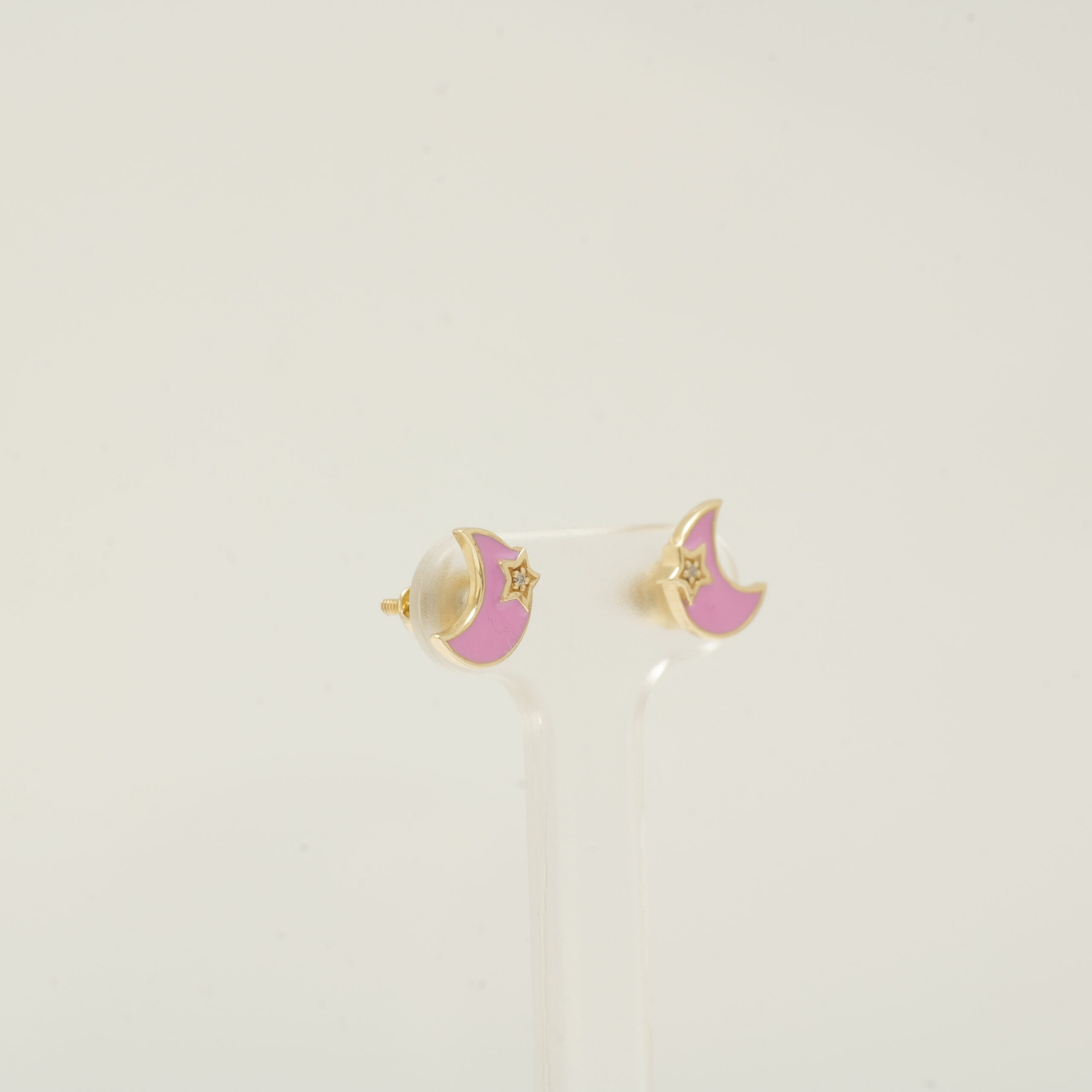 Moon and Star Diamond Kids Earrings, 14k Solid Gold, Natural Diamond, Minimalist Celestial Enamel Jewelry, Gift for toddlers, girls, and kid