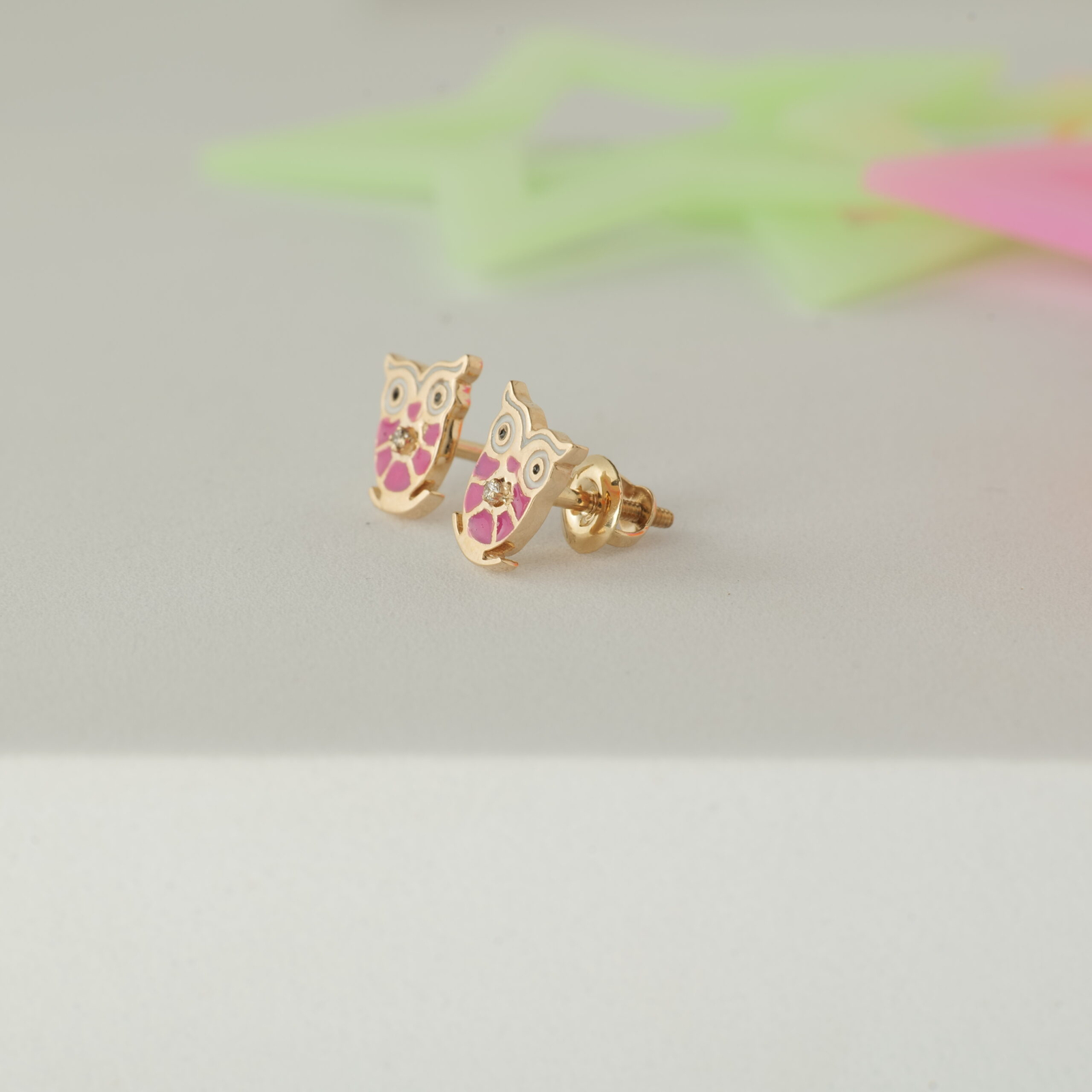 Owl-shaped gold studs with pink enamel details and a natural diamond accent. Secure and lightweight for everyday wear. A fun accessory for birthdays, special moments, or daily styling. Perfect gift for little animal lovers.