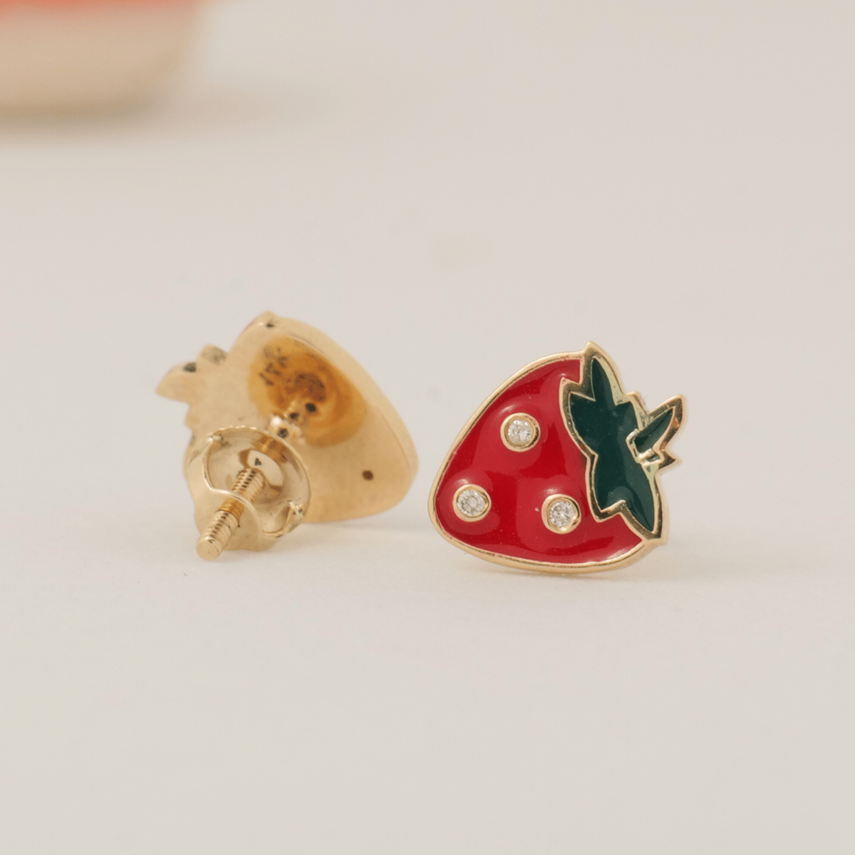 Strawberry Diamond Kids Studs, 14k Solid Gold, Natural Diamond, Enamel Fruit Earrings, Everyday Jewelry, Gift for toddlers, girls and kids